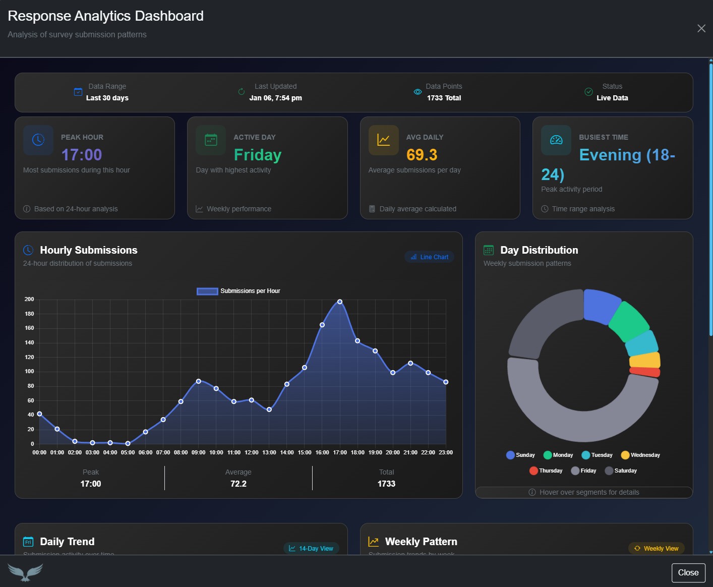 - Advanced Visual Analytics: Uncover trends with interactive charts, including an hourly submission trend line, a day-of-week distribution pie chart, daily and weekly pattern charts, and focused time-range analysis.