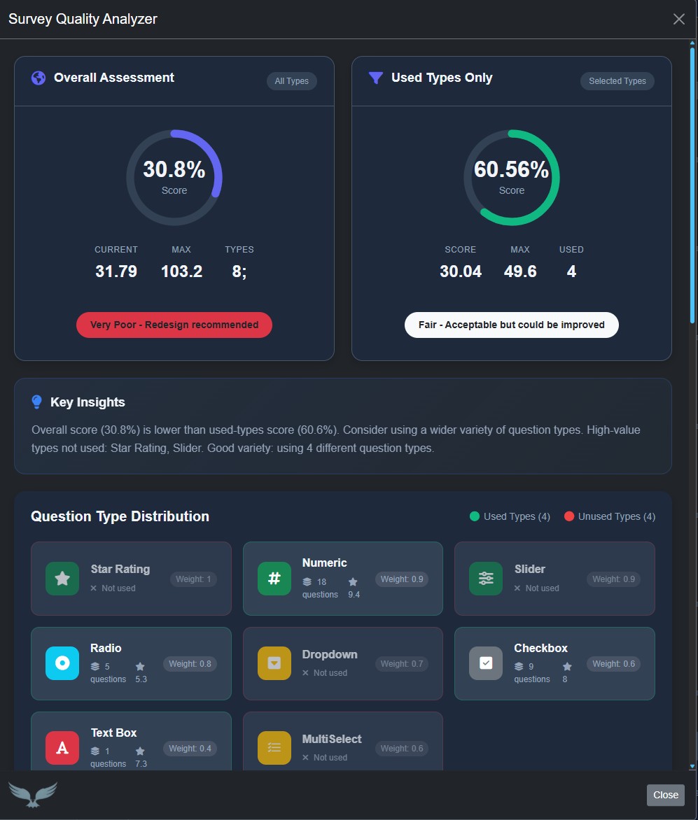 Elevate your data quality before you publish. Our intelligent analyzer, powered by proven research and methodological algorithms, evaluates your survey’s structure and provides a tailored quality score from two perspectives: a theoretical score based on all available best-practice options, and a practical score based on the tools you’ve actually used. You’ll receive specific, actionable recommendations to strengthen questions, optimize answer choices, and improve overall design, backed by a visual breakdown of your answer-type distribution.