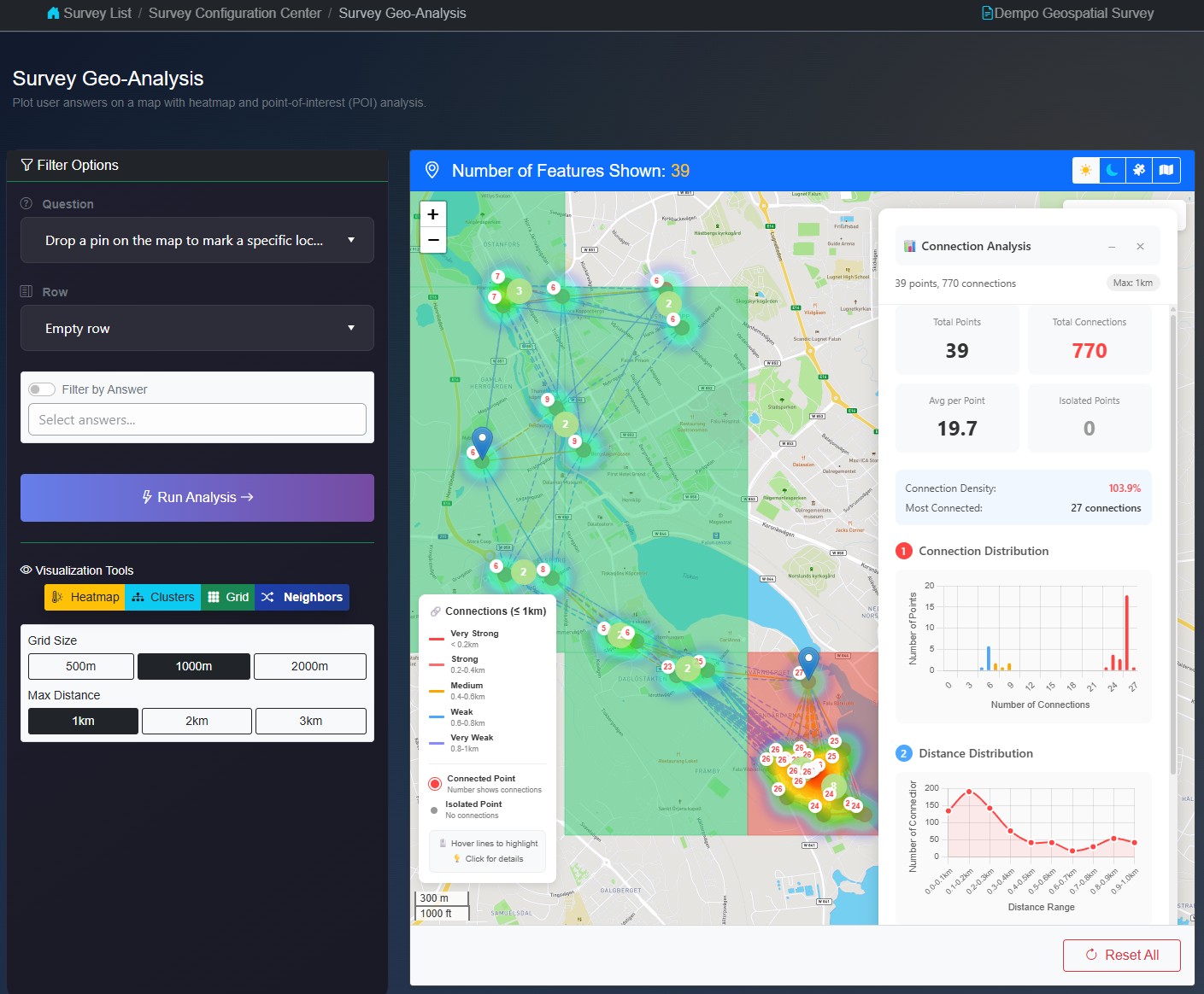 Our geo-analysis suite transforms raw location data into clear, actionable insights through four complementary tools. Use Heat Maps to instantly visualize hotspots and patterns with intuitive color gradients. Switch to Grid Analysis when you need exact point counts per area for precise, data-driven decisions. For large datasets, Clustering keeps your map clean and organized by grouping nearby points into expandable clusters. And with Nearest Neighbor analysis, discover spatial relationships by seeing connections between points at your chosen search distance. Together, these tools give you a complete picture of your geographic data from broad patterns to precise measurements, all in one place.