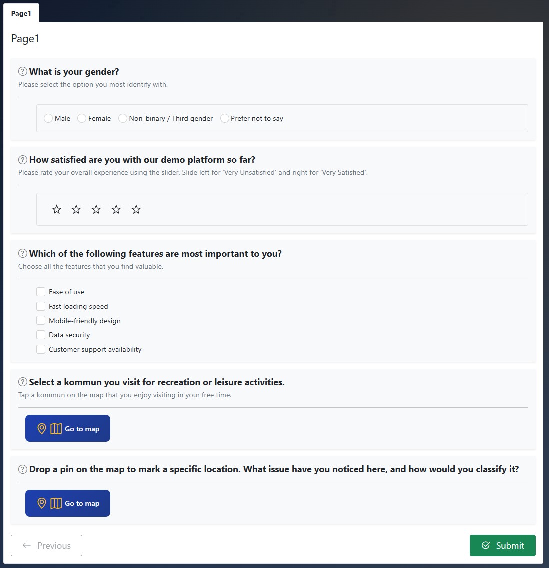 Provide the ability to design survey questions that require respondents to drop a pin or select a feature and submit their answer directly within an embedded map component.